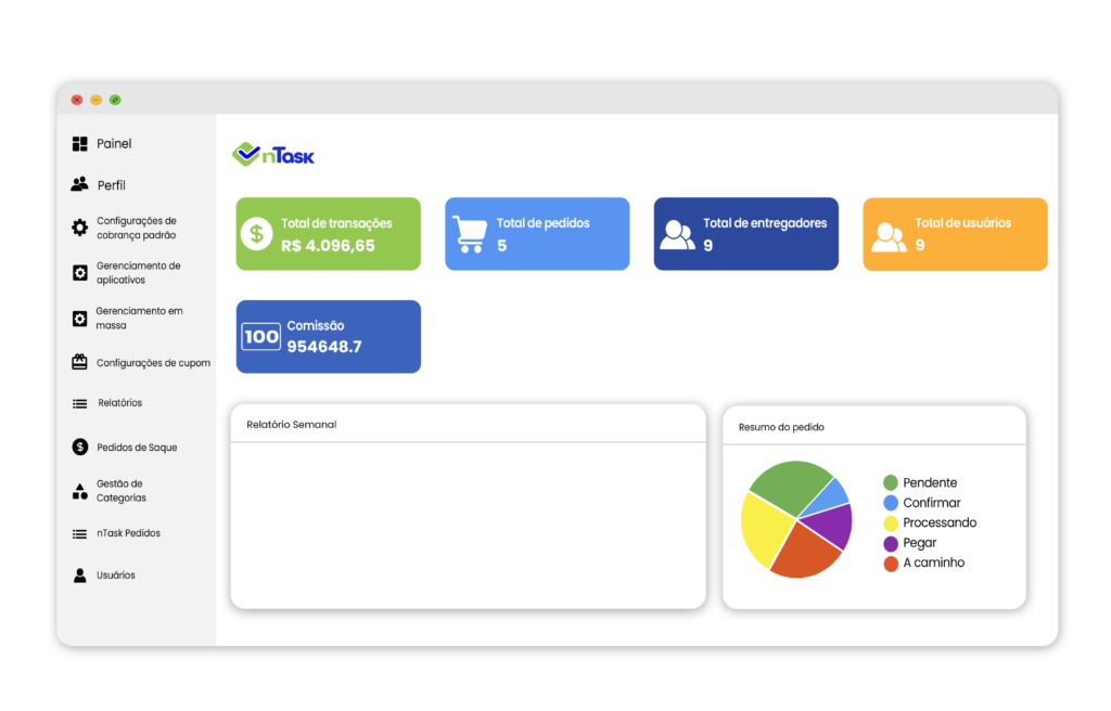 Acompanhe o andamento dos pedidos com gráficos circulares e relatórios semanais. Ideal para decisões rápidas e acompanhamento do desempenho da equipe.