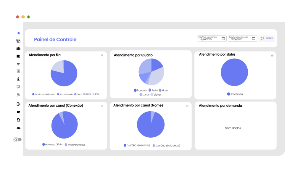 Com nosso sistema, você tem acesso a um painel de controle completo com indicadores em tempo real sobre o atendimento prestado. Visualize dados por fila, atendente, canal e status de atendimento.